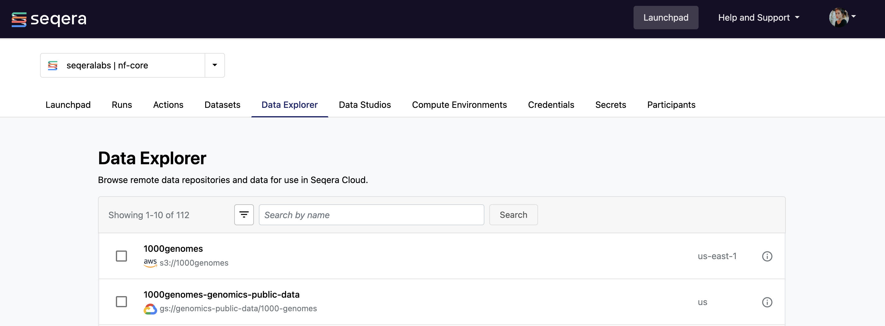 With Data Explorer, you can browse and interact with remote data repositories from organization workspaces in Seqera Platform. It supports AWS S3, Azure Blob Storage, Google Cloud Storage, and Amazon S3-compatible API storage (for example, but not limited to, Cloudflare R2, MinIO, Nebius, and Oracle Cloud).